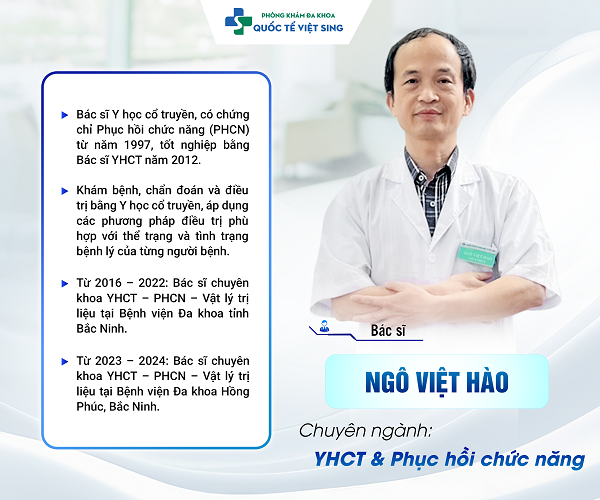 - Thế mạnh: Bác sĩ Hào sở hữu bằng Bác sĩ YHCT (2012) và Chứng chỉ Vật lý trị liệu – Phục hồi chức năng (1997), một lợi thế lớn khi điều trị các bệnh lý cơ xương khớp. Ông từng công tác tại Khoa Y học cổ truyền – Bệnh viện Đa khoa tỉnh Bắc Ninh và Bệnh viện Đa khoa Hồng Phúc, đảm bảo tay nghề vững vàng và kinh nghiệm thực tiễn phong phú. Phác đồ điều trị kết hợp nhuần nhuyễn giữa vật lý trị liệu và YHCT.