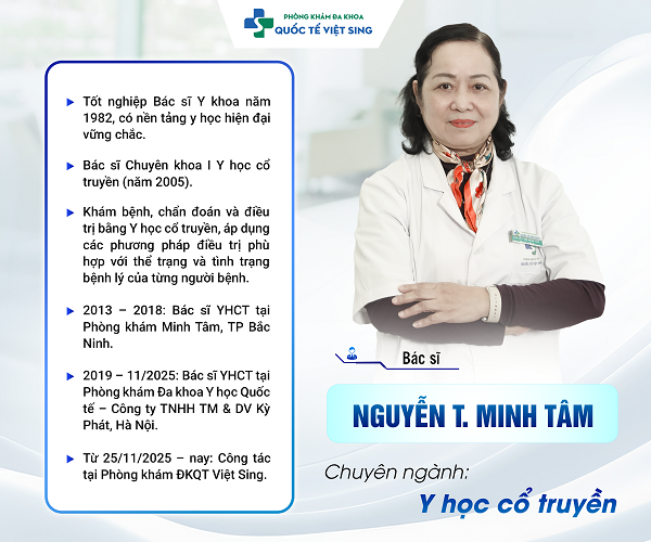 Bác sĩ Nguyễn Thị Minh Tâm là một trong những bác sĩ lão làng trong lĩnh vực Y học cổ truyền tại Bắc Ninh. Với hơn 40 năm kinh nghiệm, bà đã điều trị thành công cho rất nhiều người bệnh mắc các chứng bệnh xương khớp mãn tính.